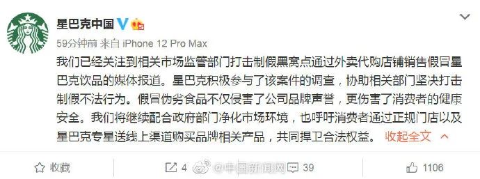 15日,@星巴克中国 发微博称,我们已经关注到相关市场监管部门打击制假黑窝点通过外卖代购店铺销售假冒星巴克饮品的媒体报道。星巴克积极参与了该案件的调查,协助相关部门坚决打击制假不法行为。假冒伪劣食品不仅侵害了公司品牌声誉,更伤害了消费者的健康安全。我们将继续配合政府部门净化市场环境,也呼吁消费者通过正规门店以及星巴克专星送线上渠道购买品牌相关产品,共同捍卫合法权益。
