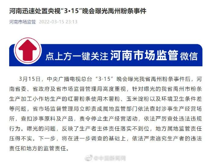 河南市场监管官方微信公众号15日晚发布消息称,“3·15”晚会曝光河南省禹州粉条事件后,针对曝光的河南省禹州市粉条生产加工小作坊生产的红薯粉条使用木薯粉、玉米淀粉以及环境卫生条件差等问题,河南省市场监督管理局立即责成属地监管部门依法查封涉事生产经营场所,查扣涉事原料及产品,责令停止生产经营活动,依法严厉查处违法违规行为。下一步,将在进一步调查的基础上,依法严肃追究生产者的违法责任和地方的监管责任。