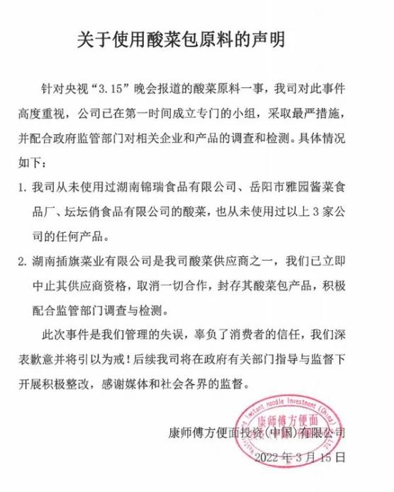 16日凌晨,康师傅方便面投资(中国)有限公司发布声明称:湖南插旗菜业有限公司是我司酸菜供应商之一,已立即中止其供应商资格,取消一切合作,封存其酸菜包产品,积极配合监管部门调查与检测。