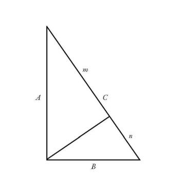 依据这两条线索,便可以很有把握地复现爱因斯坦的证明。示意图画出了一个直角三角形及从直角顶点到对边的垂线, 并对各线段作了标注:A、B、C 是直角三角形三条边的长度,m、n 为斜边被垂线分成的两个线段的长度。显然,图中的两个小直角三角形分别跟大直角三角形共享一个锐角,从而“各边的关系”完全相同。