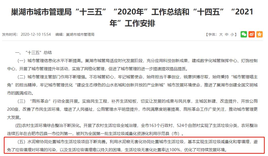 这一点在巢湖市城市管理局“十三五”2020年工作总结中得到了印证:“水泥窑协同处置城市生活垃圾项目不断完善。利用水泥窑无害化协同处置城市生活垃圾,基本实现生活垃圾减量化和零填埋,避免了垃圾填埋对环境的污染,以及生活垃圾填埋难以持久的困境,生活垃圾无害化处置率达100%,优化了可持续发展环境。”在第五届全国文明城市创建评比中,巢湖市脱颖而出。中材安徽在文明创城的进程中功不可没。