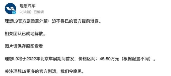 相关的文案没有透露任何信息,只有上次已经公布过的 45—50 万的预售价和北京车展期间发布的时间信息,同时理想再次强调了 L9 会有不同配置。