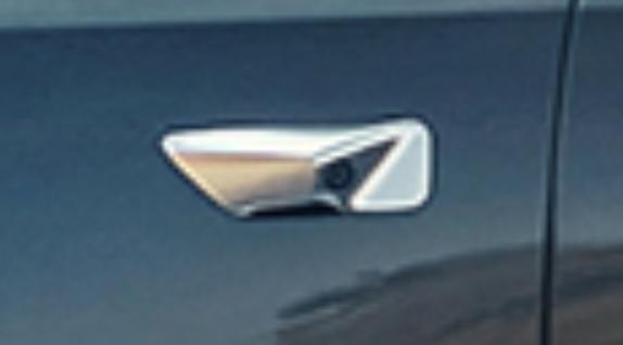 车侧的摄像头饰板采用了银色的材质,和车身形成了撞色的效果;