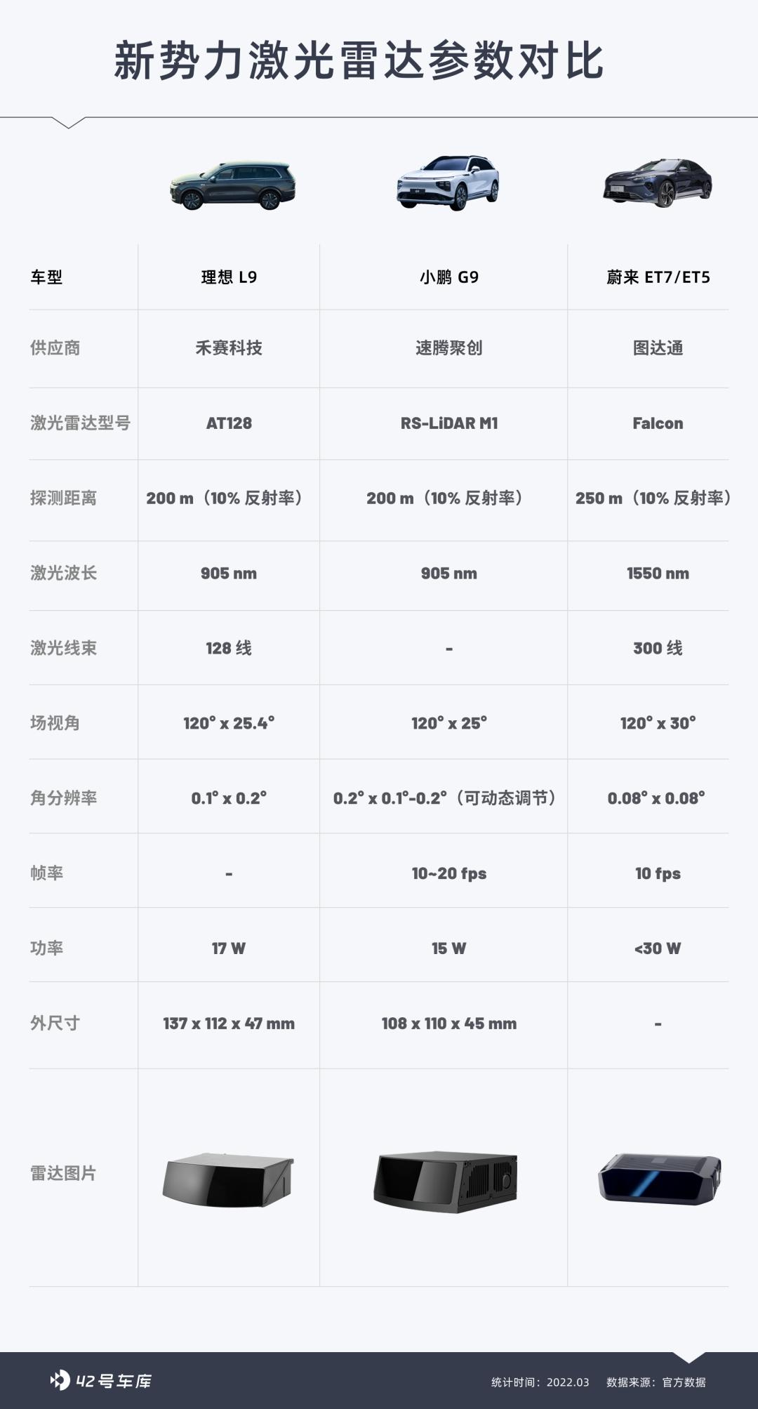 我们也搜集了小鹏 G9 和蔚来 ET7 的激光雷达参数,大家可以参考。