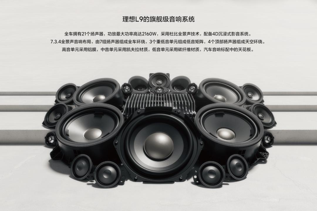 根据理想官方介绍:「理想 L9 的旗舰级车身提供了更大的声学腔体容积,前部双 8 英寸低音单元设计使低频下潜更足,配合车尾大功率低音单元组成的矩阵,让低音均匀分布在车内。全车拥有 21 个扬声器,高音单元采用铝膜,中音单元采用凯夫拉材质,低音单元采用碳纤维材质,汽车音响标配中的天花板。」