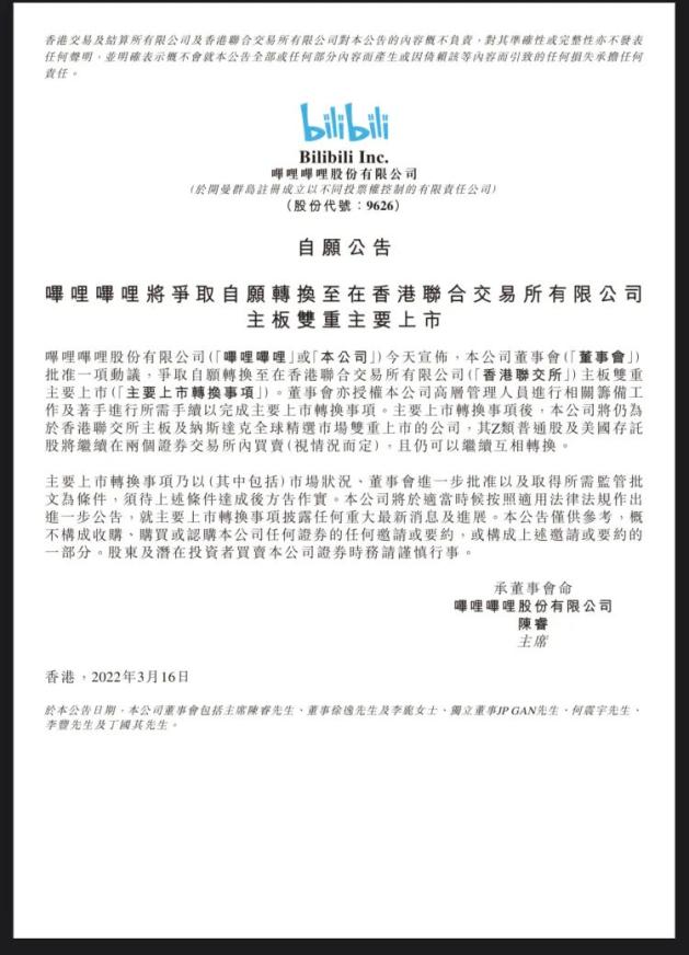 B站发布公告称,将争取自愿转换至在港交所主板双重主要上市。