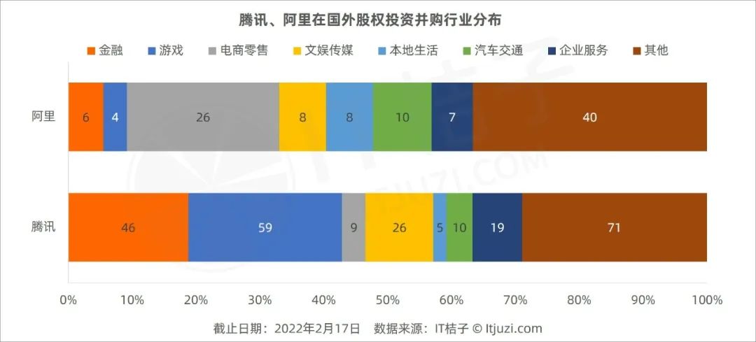 从对比图可以直观地看到,不论是在投资数量还是占自身的比重上,腾讯在游戏和金融领域出手次数最多,在策略上有点类似一边增强优势,一边补足短板。而在电商零售领域,阿里在海外投资并购的出手次数远超腾讯。