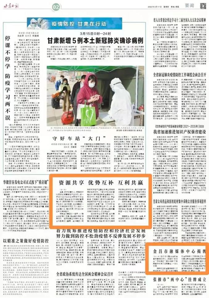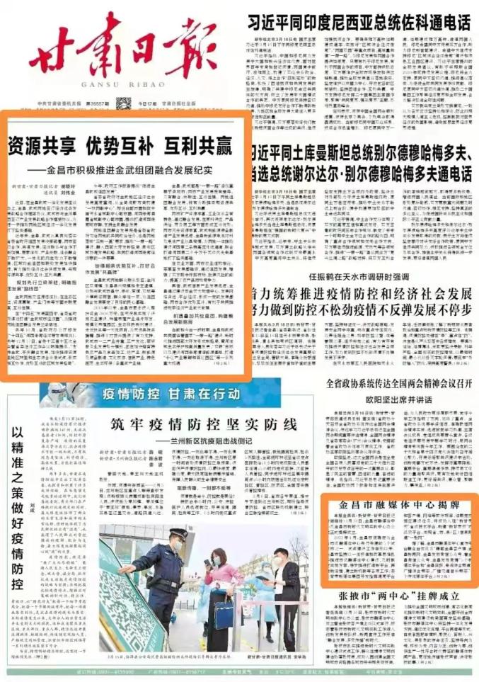 3月17日,《甘肃日报》头版两条新闻聚焦金昌,分别以《资源共享 优势互补 互利共赢——金昌市积极推进金武组团融合发展纪实》和《金昌市融媒体中心揭牌》为题,对金昌进行了报道,以下为全文: