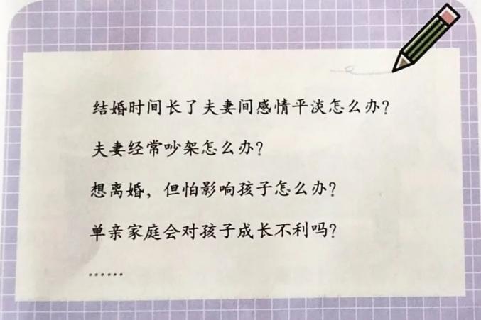 (10)感情不和的夫妻想在孩子长大成人后再离婚,其实没有必要。如果到了非分开不可的地步,不要因为怕影响孩子而维持表面和平。父母关系不好,孩子能感觉到,会变得更加不安,可能会带来更大的影响。可以告诉孩子:父母只是不适合一起生活了,父母对孩子的爱是不变的,甚至还会加倍。不要低估孩子的接受能力。如果父母离异,注意不要在孩子面前丑化对方,不要将夫妻关系与亲子关系混为一谈。