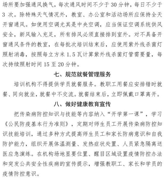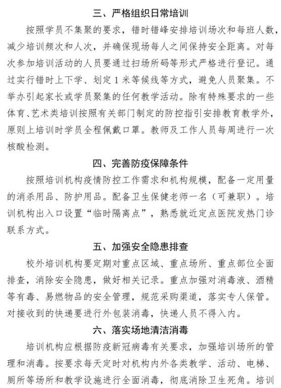 三、压实压牢从业者责任,坚决把疫情防控举措落到实处。各地教育行政部门要结合疫情防控工作,主动担当作为,在当地党委政府的领导下,进一步统筹党委政法委、卫生防疫、体育、市场监管、信访、公安、司法等部门力量,统筹施策,综合治理,对校外培训机构监管到位。压实压牢从业者责任,要求各机构将教职员工、学员的生命安全和健康放在首位,严格落实疫情防控各项管控措施,非必要不外出、非必要不聚会,严格落实疫情防控的主体责任,关注重点人员情况,加强重点人群管控,确保培训机构疫情防控主体责任落实到位、疫情防控方案到位、日常管理实施到位、人员健康核查到位。