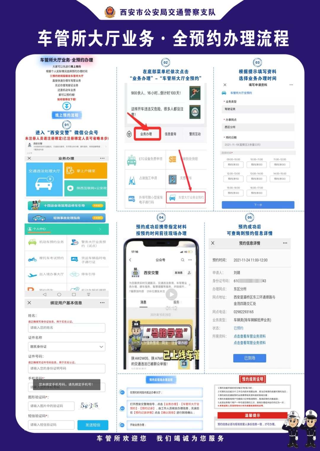 近期我市疫情防控形势依然严峻,请广大群众自觉遵守各项防疫要求,减少不必要的出行,办理车驾管业务尽量选择在互联网平台和12123手机App上办理相关业务。确需到全市各车管所、社区服务站、警务大厅办理车驾管业务的,请提前通过西安交警微信公众号选择预约办理地点和时段,按时到场后,请全程规范佩戴口罩,注意做好个人防护,保持安全距离,配合工作人员进行测温,主动出示并接受健康码、行程卡和相关核酸证明查验。