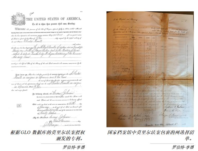 在确定捐赠地块过程中,为了填补GLO 数据库存在的空白,作者对档案和印刷资料进行了研究。最主要的档案来源是华盛顿特区国家档案馆的土地管理局记录中包含的州拨款清单。