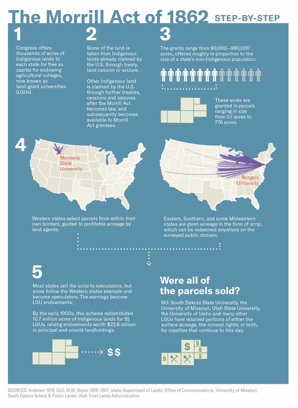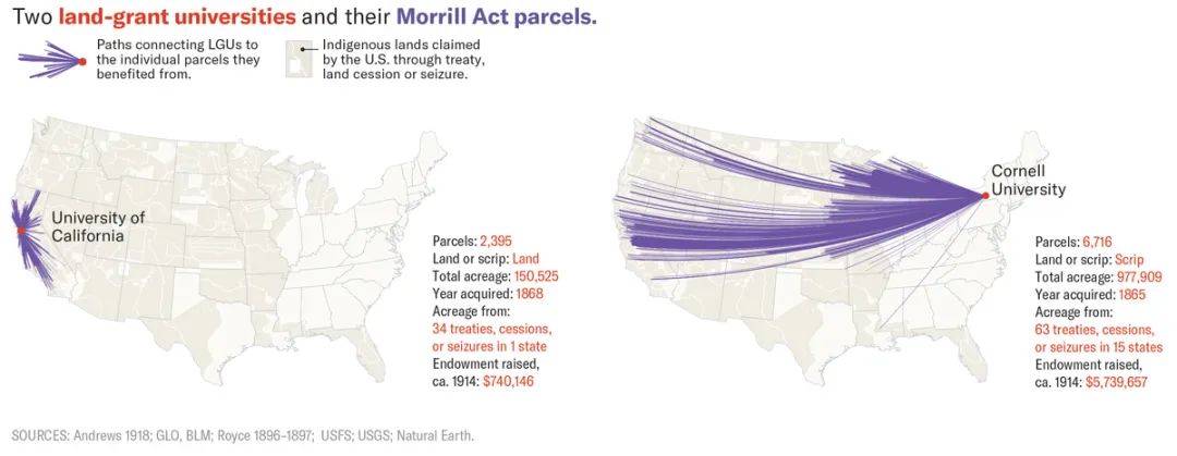 这些“被国会赠与,为大学提供资助”的土地来源于两类原住民土地:(1)当时美国已经通过条约、土地割让或扣押得到的土地;(2)在《莫里尔法案》成为法律后,美国通过进一步的条约、土地割让和扣押获得的土地。