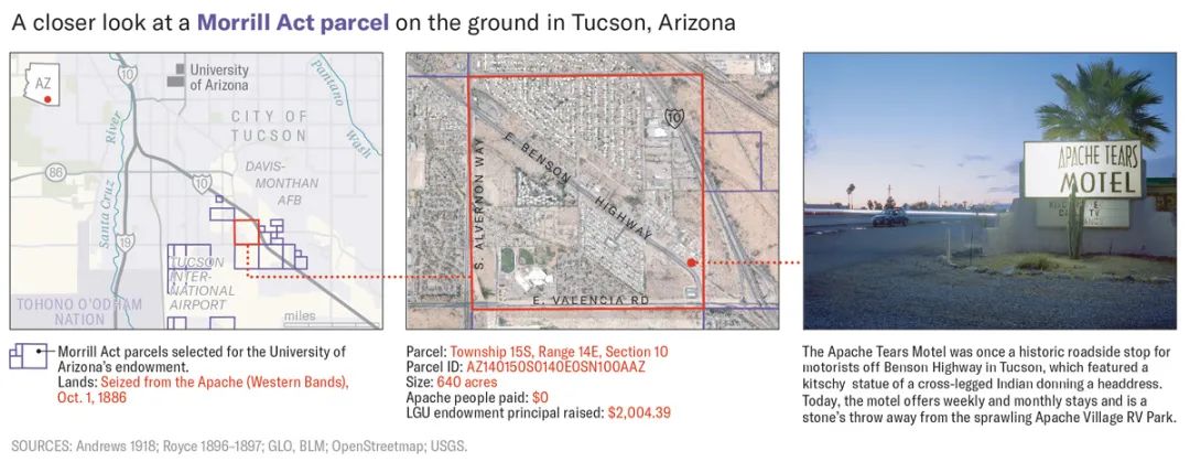 其中,以红色方形标出的地块为例,这块面积640英亩的土地是从阿帕奇人(西部原住民部落)手中夺取的,为赠地大学带来的捐赠本金高达2004.39美元。而土地的原主人阿帕奇人得到了多少呢?0!