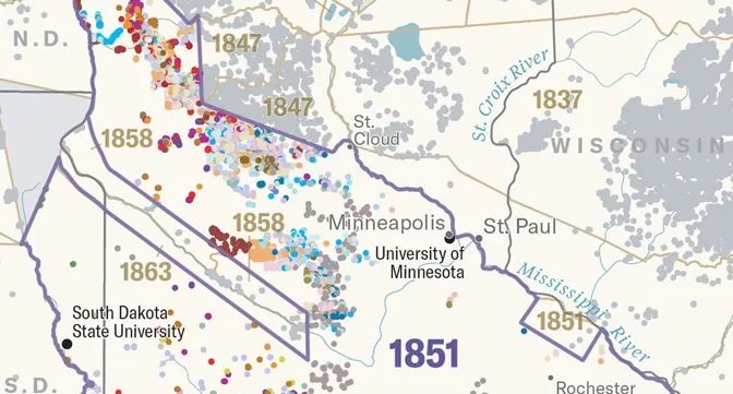 小圆点:表示使得赠地大学收益的地块,灰色为除本图分析重点事件(1851年土地割让)之外的地块,其他颜色为受1851年土地割让影响的地块,不同学校对应不同颜色。