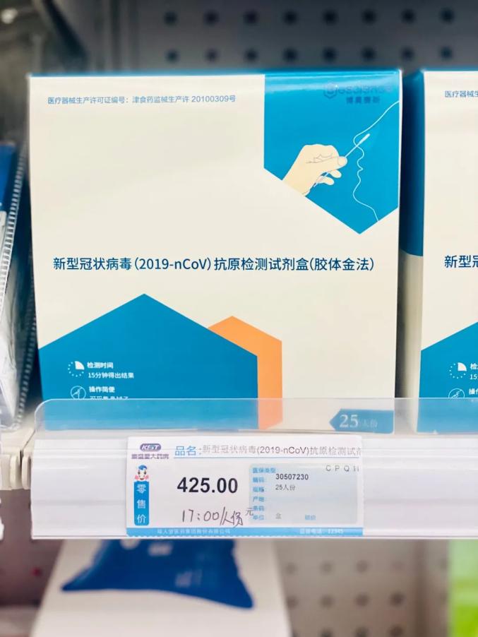 据了解,该检测试剂盒为天津博奥赛斯生物科技股份有限公司生产,规格为25人份/盒,425元/盒(17元一份),目前试剂盒还无法使用医保卡购买,消费者需实名购买并严格按照产品说明书完成自测。