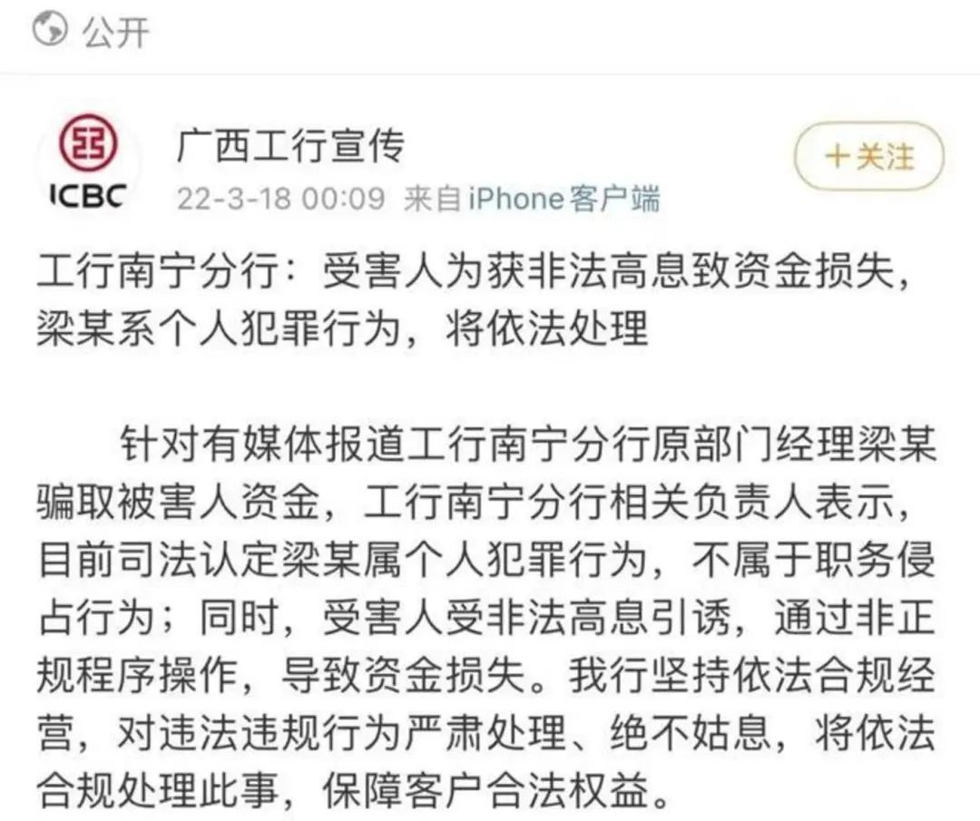 3月18日,工行南宁分行在官微“广西工行宣传”发布公告回应称,受害人为获非法高息致资金损失,梁某(指梁建红)系个人犯罪行为,将依法处理、绝不姑息,保障客户合法权益。
