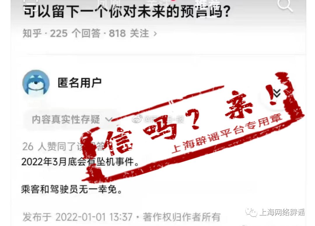 一张显示为知乎社区的截图上,有匿名用户对“可以留下一个你对未来的预言吗?”的提问进行了回答,答案是:“2022年3月底会有坠机事件”,而回答时间为2022年1月1日,因此有人称坠机前出现了“神预言”。