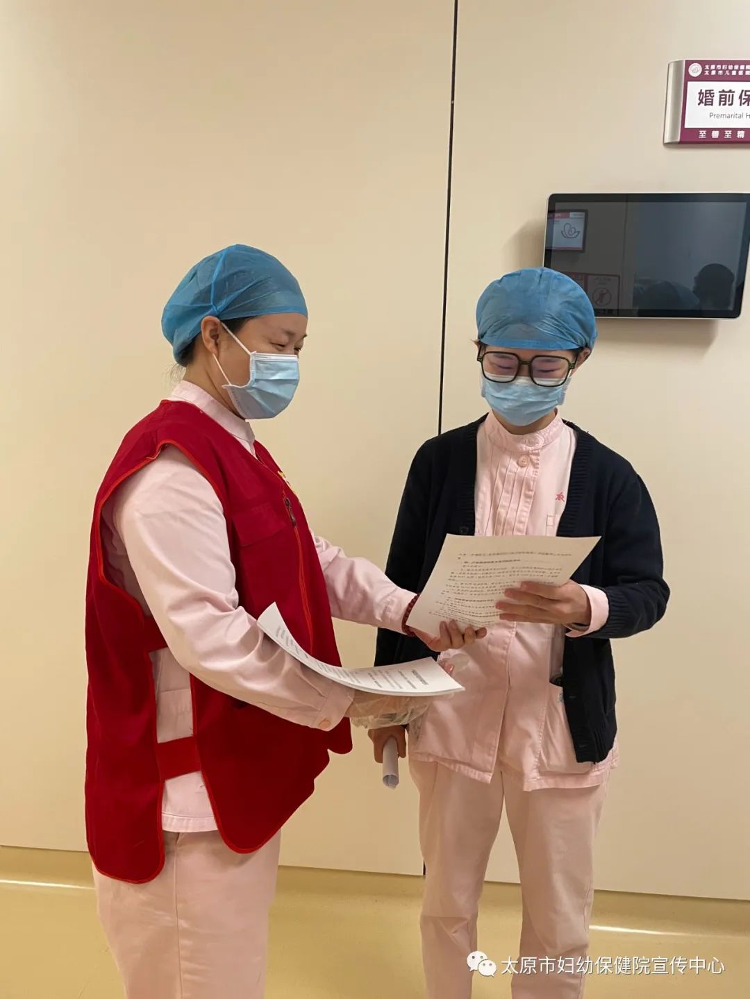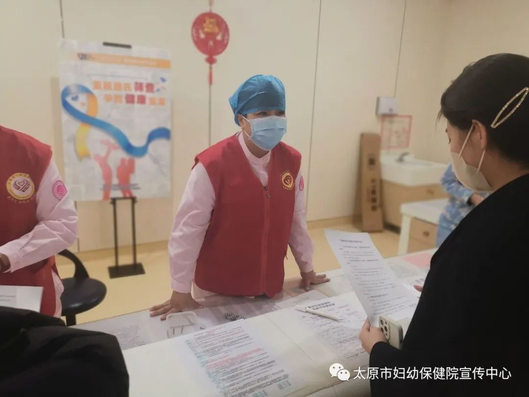 产科的医护人员身着红色志愿者马甲,在产科门诊给每一位前来检查的孕妈妈免费发放唐氏综合征宣传单,并告知太原市妇幼保健院产科是唐氏筛查的免费医疗机构,在这里可以享受免费产前筛查和诊断服务项目,这项服务也是2022年省政府关注的妇幼民生实事,引导生育妇女怀孕后主动接受唐氏筛查,做好孕期保健,关注出生缺陷预防。