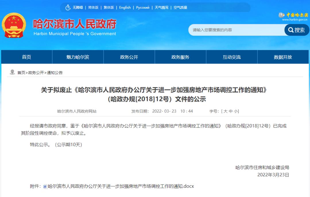 3月23日,哈尔滨市人民政府网站发布关于拟废止《哈尔滨市人民政府办公厅关于进一步加强房地产市场调控工作的通知》文件的公示:经报请市政府同意,鉴于《哈尔滨市人民政府办公厅关于进一步加强房地产市场调控工作的通知》已完成其阶段性调控使命,拟予以废止。