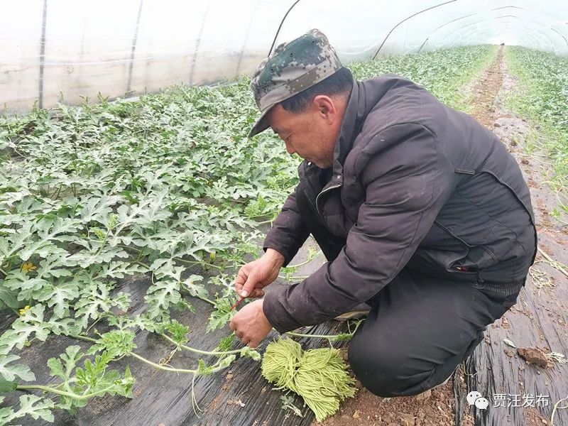 在吴士才的西瓜大棚里,绿油油的西瓜苗有序地铺在地上,拳头大小的西瓜圆鼓鼓的,长势喜人。吴士才忙着给西瓜授粉,并且用各种不同颜色的绳子在一旁做标记。