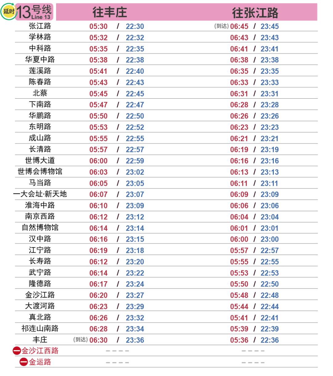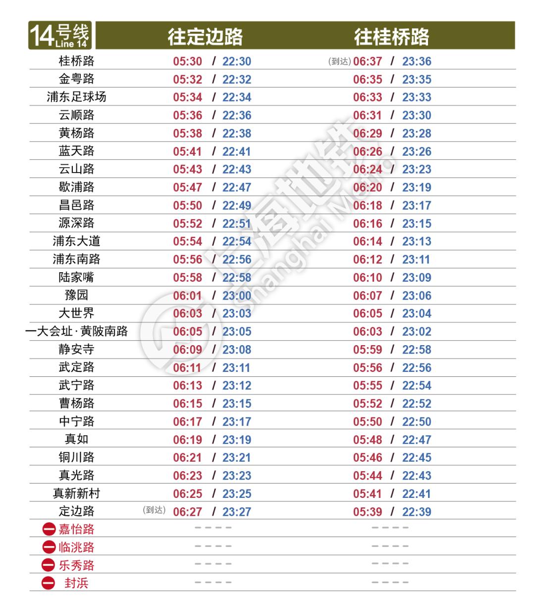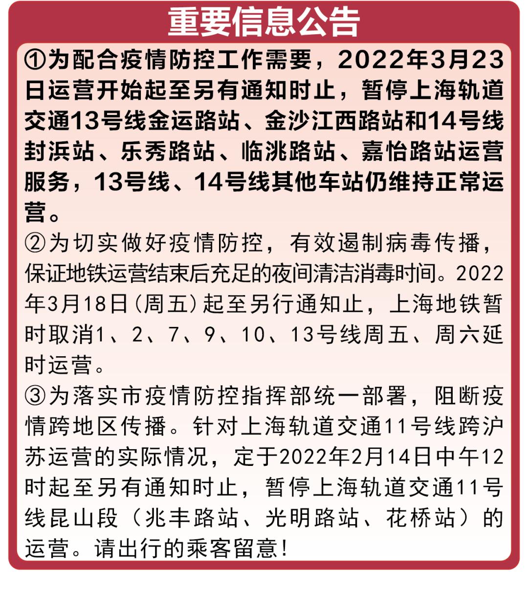 为配合疫情防控工作需要,2022年3月23日运营开始起至另有通知时止,暂停上海轨道交通13号线金运路站、金沙江西路站和14号线封浜站、乐秀路站、临洮路站、嘉怡路站运营服务,13号线、14号线其他车站仍维持正常运营。全网首末班车时刻表也随之更新,小伙伴们记得收藏哦!