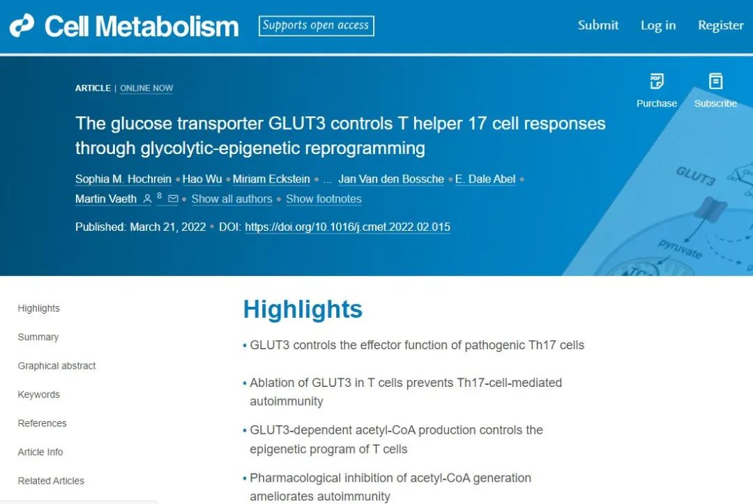 研究结果于近期发表在《Cell Metabolism》杂志上,题为:“The glucose transporter GLUT3 controls T helper 17 cell responses through glycolytic-epigenetic reprogramming”。