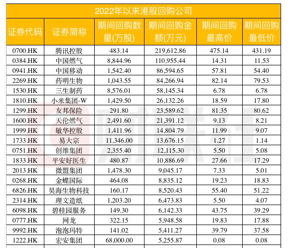 从回购金额排名来看,腾讯控股、中国燃气、中国移动、药明生物与三生制药的累计回购金额位居前五。另外,进入回购榜前十的港股上市公司还包括:小米集团、友邦保险、天伦燃气、敏华控股与易大宗。
