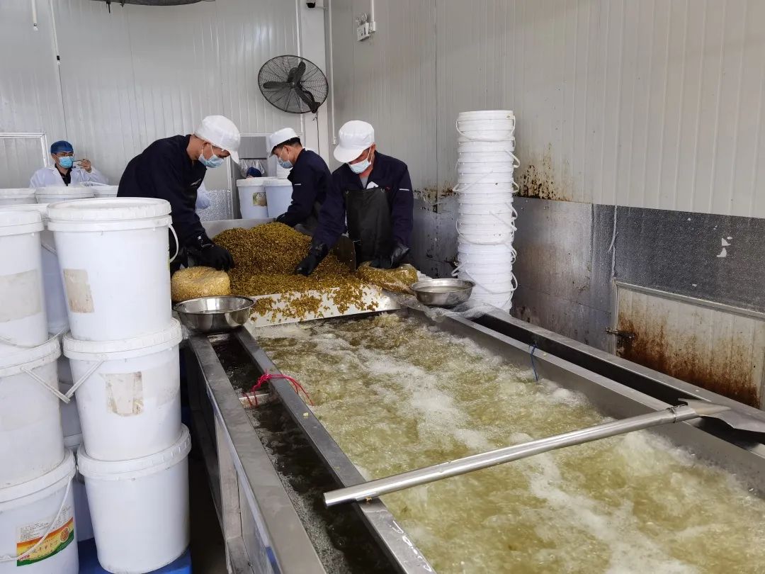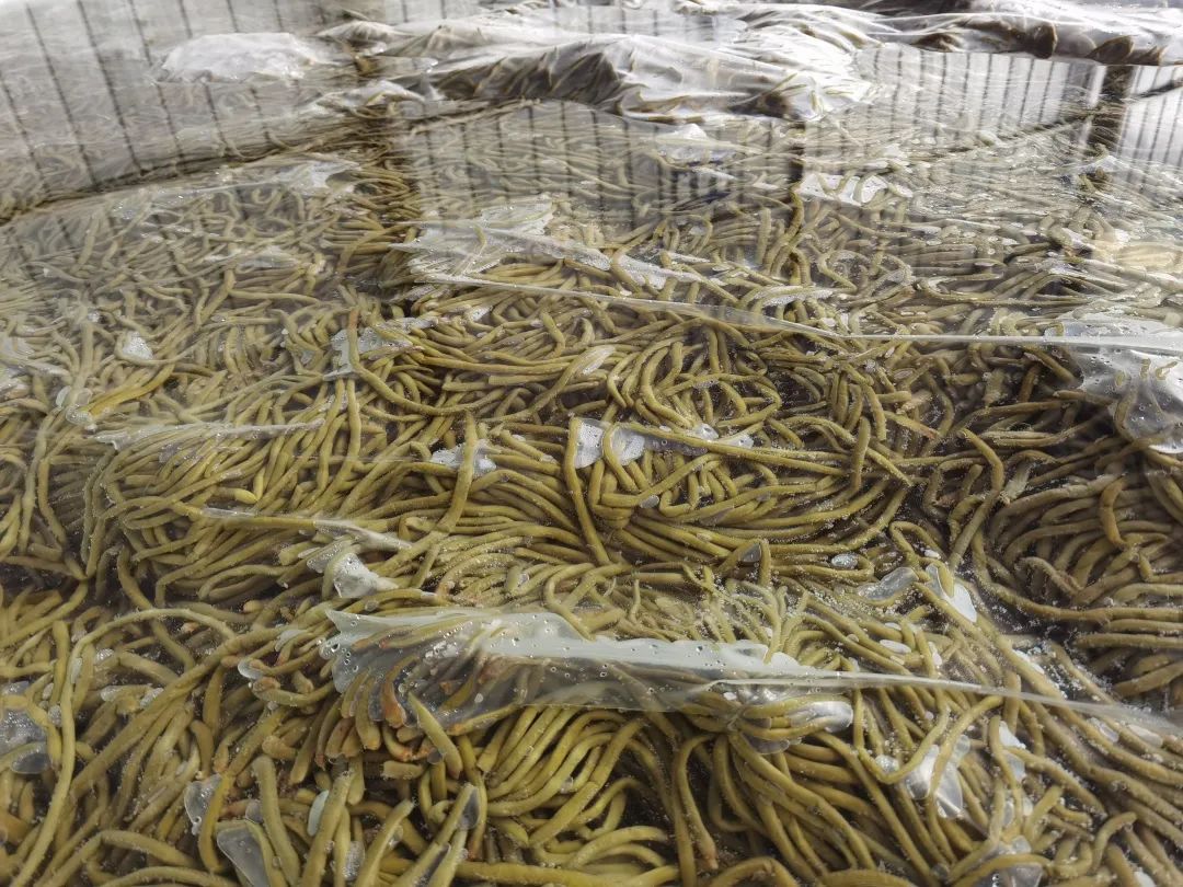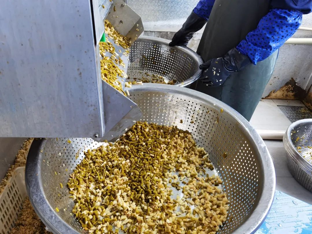 张鹏介绍说,柳州螺蛳粉为了保证传统风味,料包中的酸豆角和酸笋遵循传统湿法腌制工艺制作。其中,腌制酸豆角一共分为四步,首先,新鲜豆角到厂以后,需要经过初步清洗,去除灰尘杂质;然后进入到传送带环节,用气泡详细清洗,再装入腌制桶。接着往桶里加入盐量约8°的盐水,使豆角发酵;四到五天之后,豆角初步发酵成熟,就在上面覆盖薄膜,再注入水,让豆角保持密封的状态。