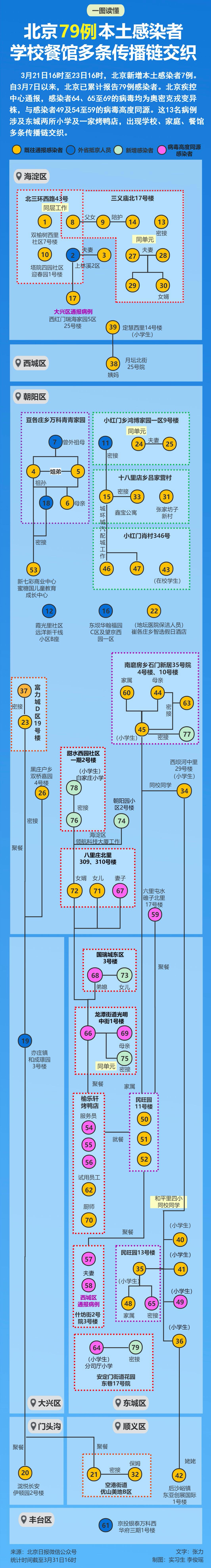 记者发现,这13名病例涉及两所小学、一家烤鸭店及多个家庭,这证明了出现学校、家庭、餐馆多条传播链交织的情况。同时,由于未及时报告聚餐史,造成疫情扩散的传播链仍在延长,关联病例的居住地、工作地已涉朝阳、海淀、东城、西城4区。