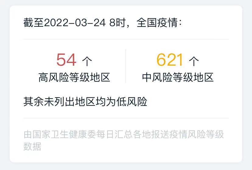 截至3月24日8时,全国共有高风险区54个,中风险区621个。