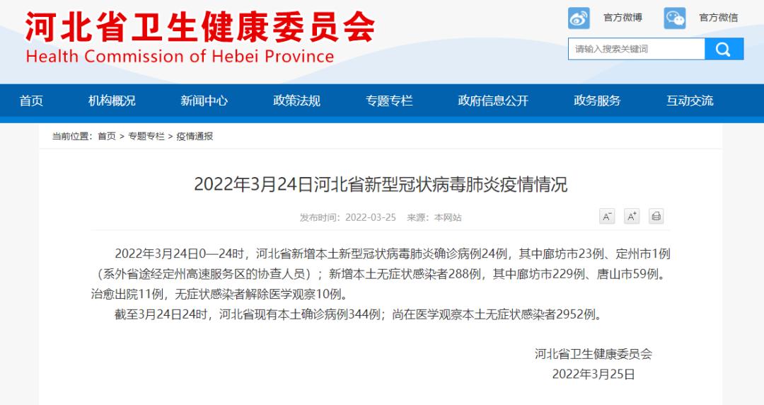 2022年3月24日0—24时,河北省新增本土新型冠状病毒肺炎确诊病例24例,其中廊坊市23例、定州市1例(系外省途经定州高速服务区的协查人员);新增本土无症状感染者288例,其中廊坊市229例、唐山市59例。治愈出院11例,无症状感染者解除医学观察10例。