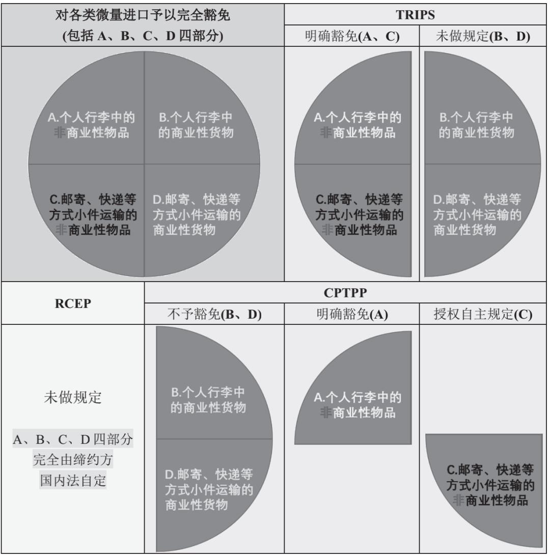 微量进口分为个人行李和小件运输(如邮递、快件)中的商业性和非商业性少量货物或物品(图1的A、B、C、D)四部分。RCEP对此方面是否可以执法豁免未作出规定。