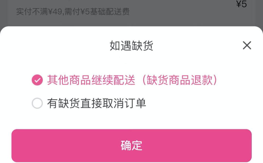 结算页面有一个“缺货选项”,就是如果有缺货是继续送达还是直接取消订单。