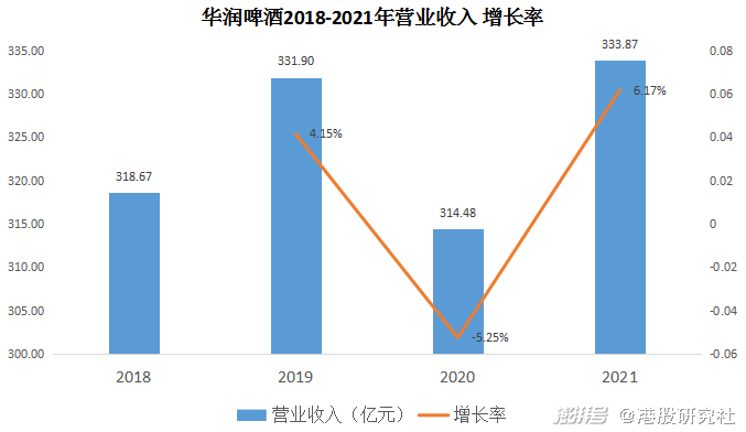 根据财报,华润啤酒2021年的综合营业额为333.87亿元,同比2020年的314.48亿增长6.2%;但与2019年的331.90亿基本持平。