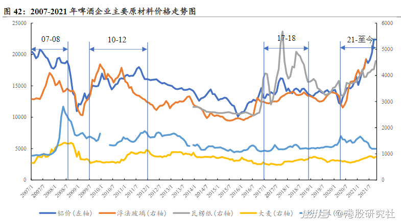 根据东北证券统计,2021年以来,啤酒主要原材料中铝、浮法玻璃、瓦楞纸价格大幅上涨,大麦价格也有所上升。