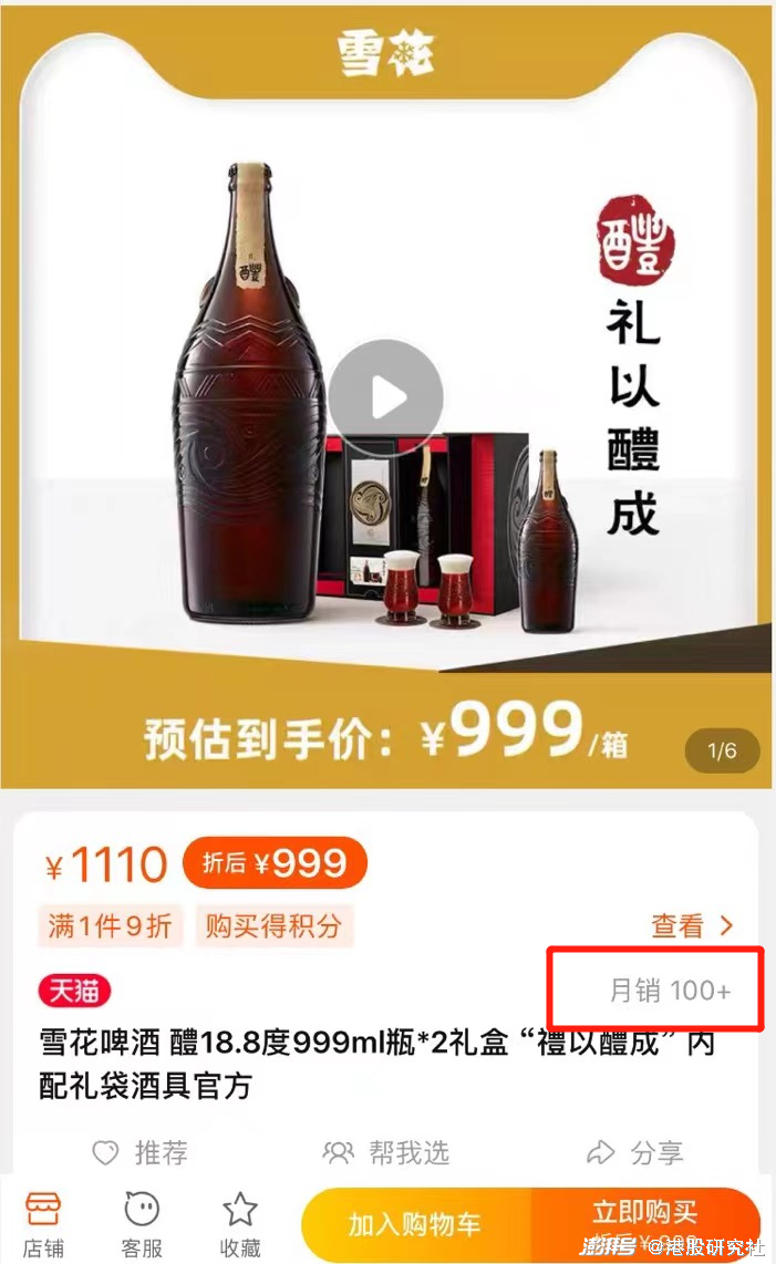 事实上,早在去年5月,华润啤酒就率先推出了两瓶装售价999元的高端啤酒“醴”,是国内最早销售自有超高端产品的啤酒厂商之一。