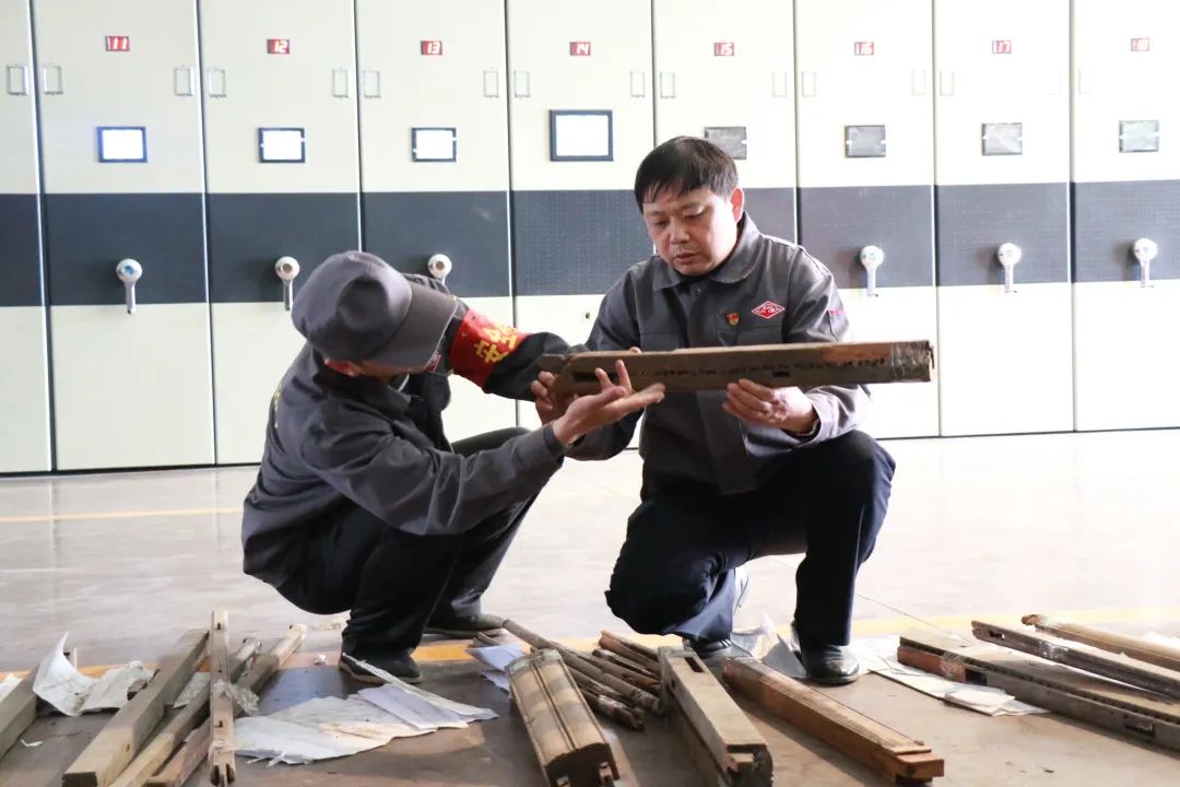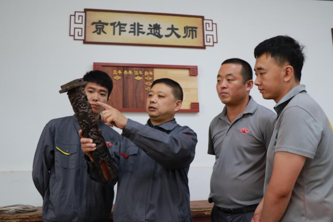 刘更生(左二)在给徒弟讲解老部件上的雕刻工艺