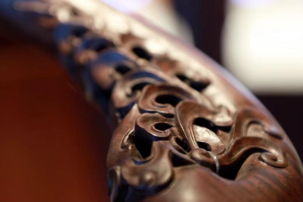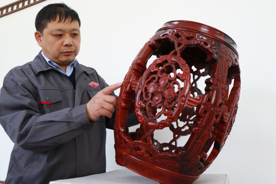 刘更生仔细检查作品紫檀透雕花卉纹绣墩