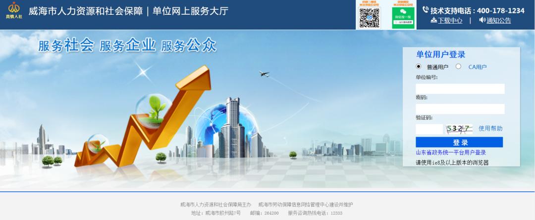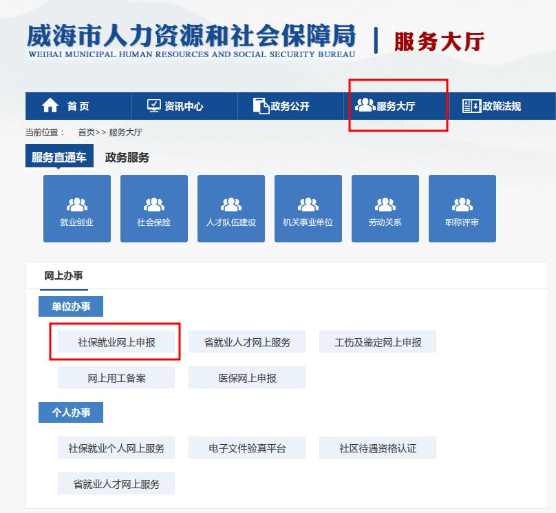登陆威海市人力资源社会保障局官网(www.rsj.weihai.gov.cn),点击服务大厅-网上办事-单位办事-社保就业网上申报,输入单位编号和密码。