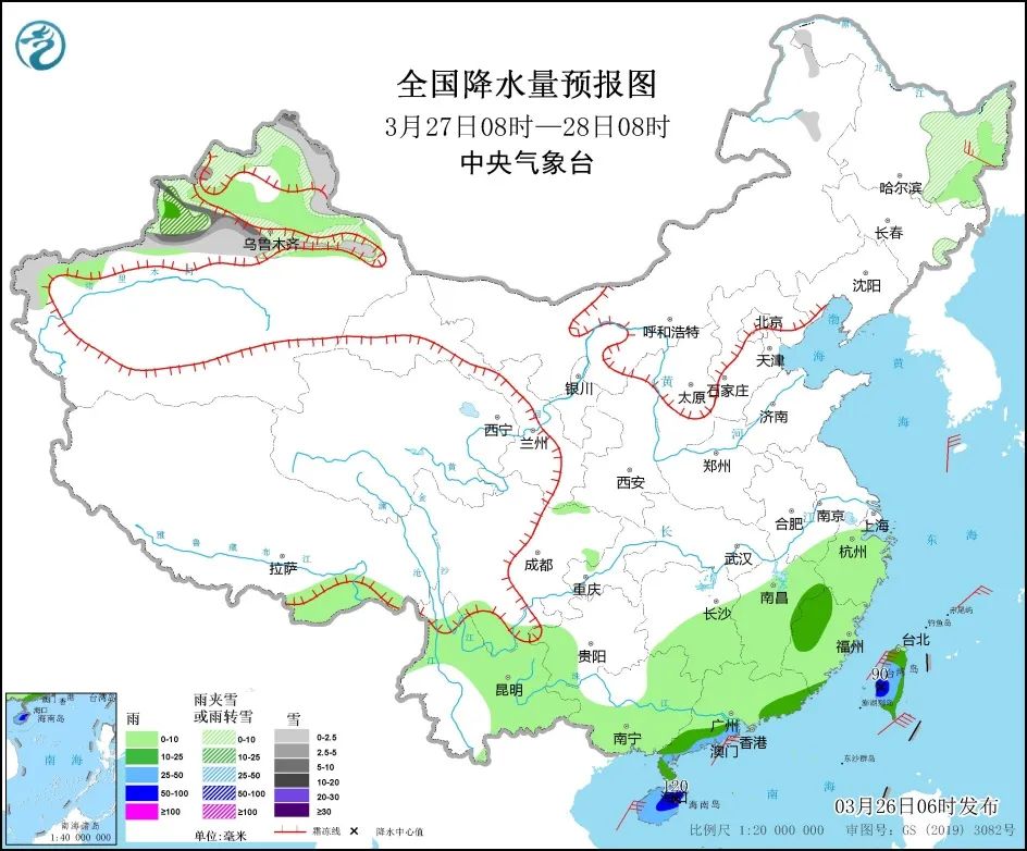 3月27日08时至28日08时,新疆沿天山地区和伊犁河谷等地部分地区有小到中雪,其中,新疆沿天山部分地区有大到暴雪。华南南部、海南岛、台湾岛等地部分地区有中到大雨,其中,海南岛中东部、台湾岛中南部等地部分地区有暴雨或大暴雨(100~120毫米)。黑龙江东北部部分地区有4~5级风。