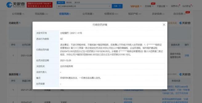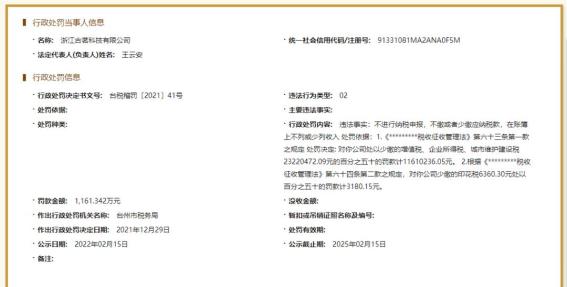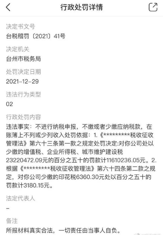 根据披露,浙江省台州市税务局决定对该公司处以少缴的增值税、企业所得税、城市维护建设税23220472.09元的50%的罚款计11610236.05元。对该公司少缴的印花税6360.30元处以50%的罚款计3180.15元。