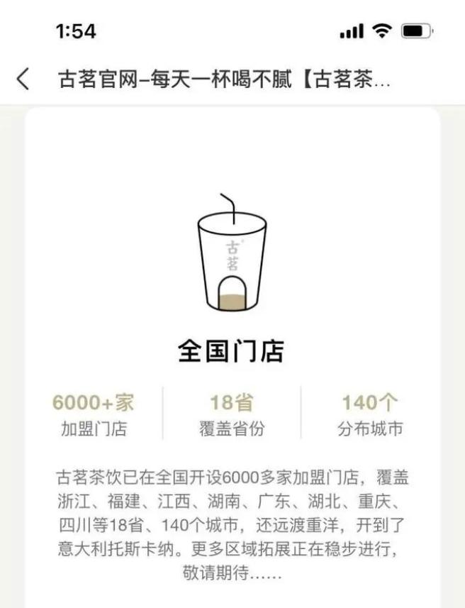 古茗官网显示,古茗茶饮已在全国开设6000多家加盟门店,覆盖全国18省份,140多个城市。