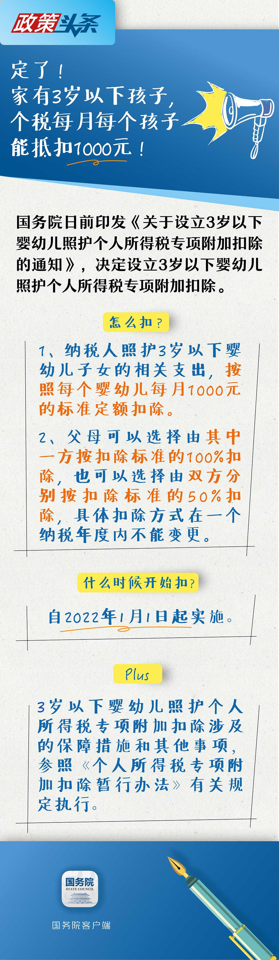 定了!家有3岁以下孩子,个税每月每个孩子能抵扣1000元