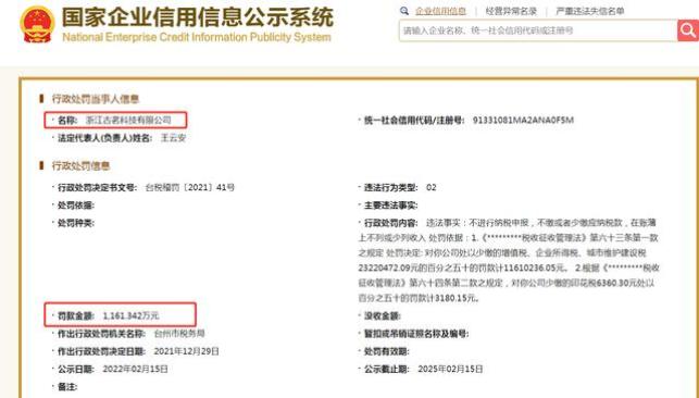 根据披露,浙江省台州市税务局决定对该公司处以少缴的增值税、企业所得税、城市维护建设税23220472.09元的50%的罚款计11610236.05元。对该公司少缴的印花税6360.30元处以50%的罚款计3180.15元。