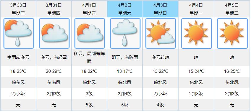 预计,今天,阴天,有中雨局部大雨,气温15到19度。阴雨天气,道路湿滑,注意交通安全。预计,30日白天至31日,转多云,有轻雾,天气暖湿;4月1日至2日,受新一股冷空气影响,有阵雨,北风加大,气温下降;3日至5日转晴朗干燥。