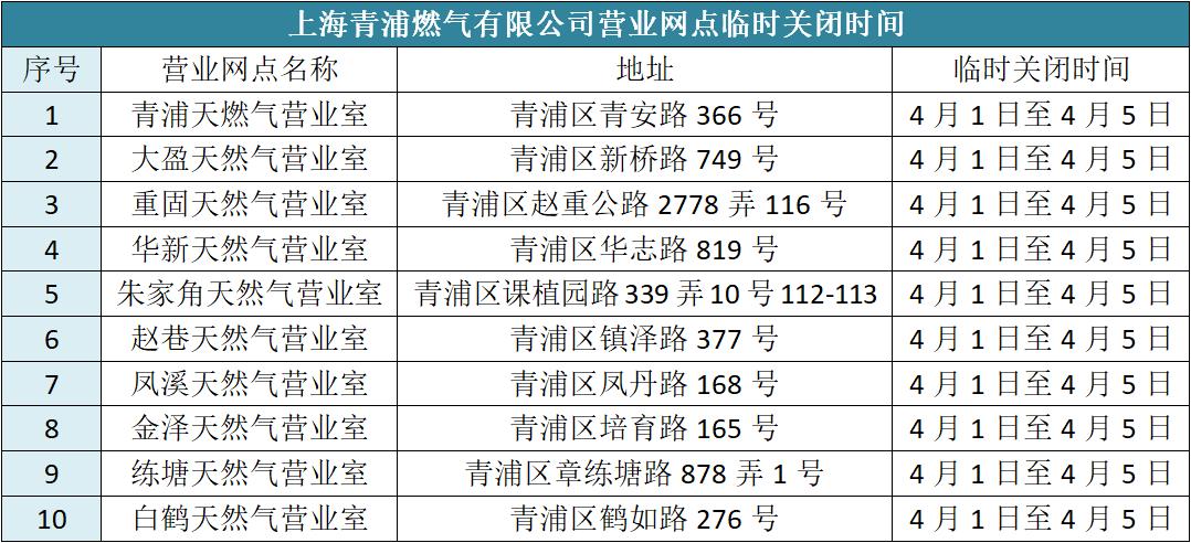 1. 4月1日起临时关闭青浦燃气各线下营业网点,4月5日后,各营业网点开放时间将根据具体疫情防控要求再行确定。您可以通过上海燃气微客服平台在线办理业务。