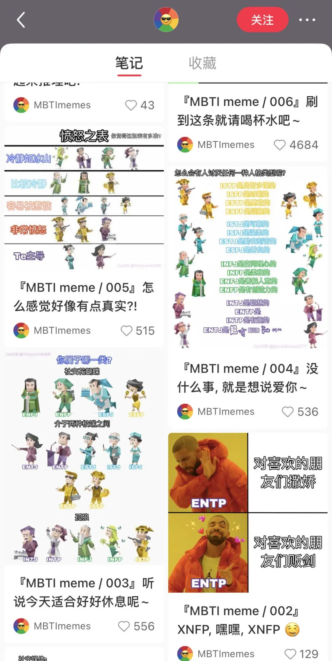 在小红书上,有一个叫MBTImemes的账号,专门搬运关于MBTI十六型人格的图,每篇热度都还不错。