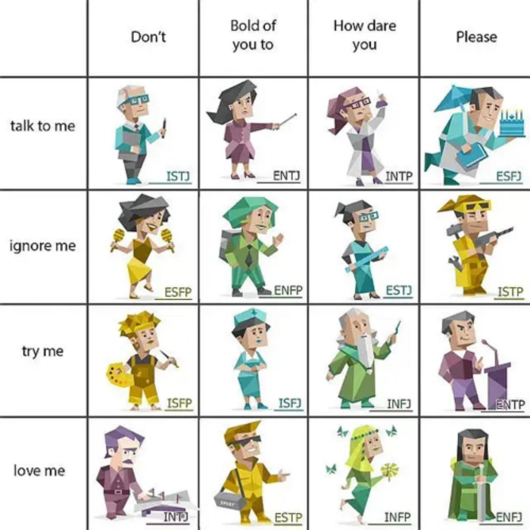 更重要的,是当你犯懒又拖沓的时候,还能用MBTI默默安慰自己:“哎呀,没办法,INTP都是这样的。”然后转头又刷起梗图。