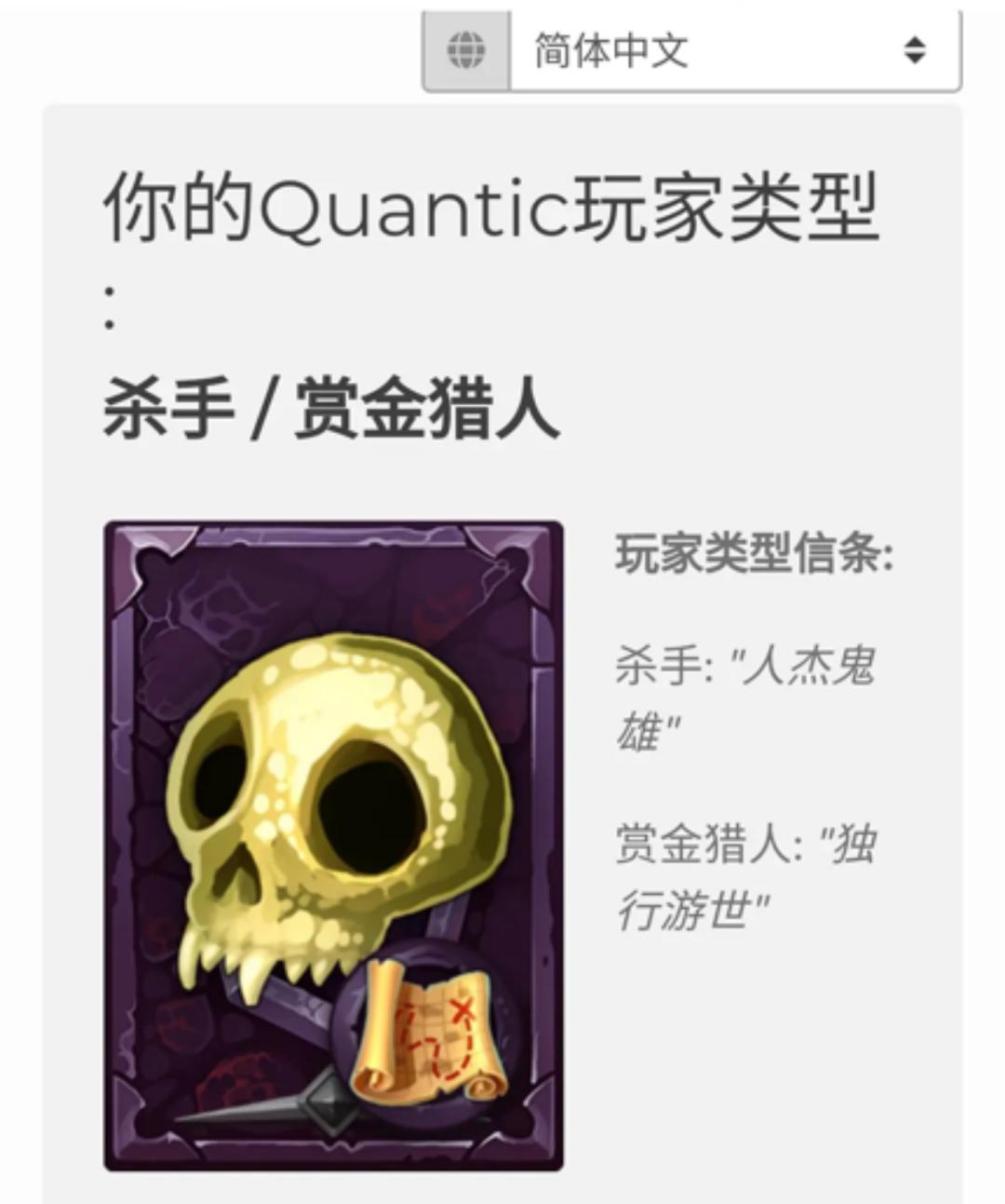 比如,游戏论坛有网友热情力荐Quantic玩家类型测试,这款测试号称是由用户分析机构,结合大五人格模型推出的专业游戏心理测试。小学英语水平就够用,报告还能中文输出。